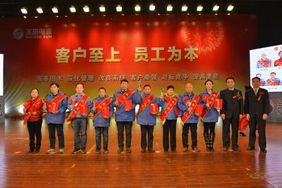 会上,高总首先宣读了2013年度创新员工、“最美圣阳人”、先进个人和先进集体名单,公司高层领导为获奖员工颁奖并表示祝贺。董事长在会上作《客户至上,员工为本,追逐变革向前进!》的讲话致辞。董事长说,面对即要规模更要精细的行业变化新局势和经济增长方式的大变革,圣阳公司没有任何理由不能与时俱进、再踏新程,圣阳人也唯有直面 “突破自身、变革创新、赋新提升”这一条道路,来追逐变革向前进!