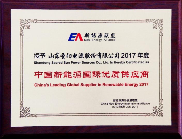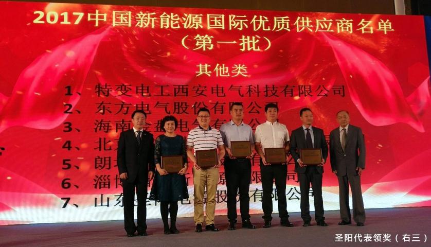 2017年6月6日,第九届中国国际新能源博览会暨储能与多能互补高峰论坛在北京中国国际博览中心盛大颁奖。圣阳电源斩获第一批“2017中国新能源国际优质供应商”大奖。
