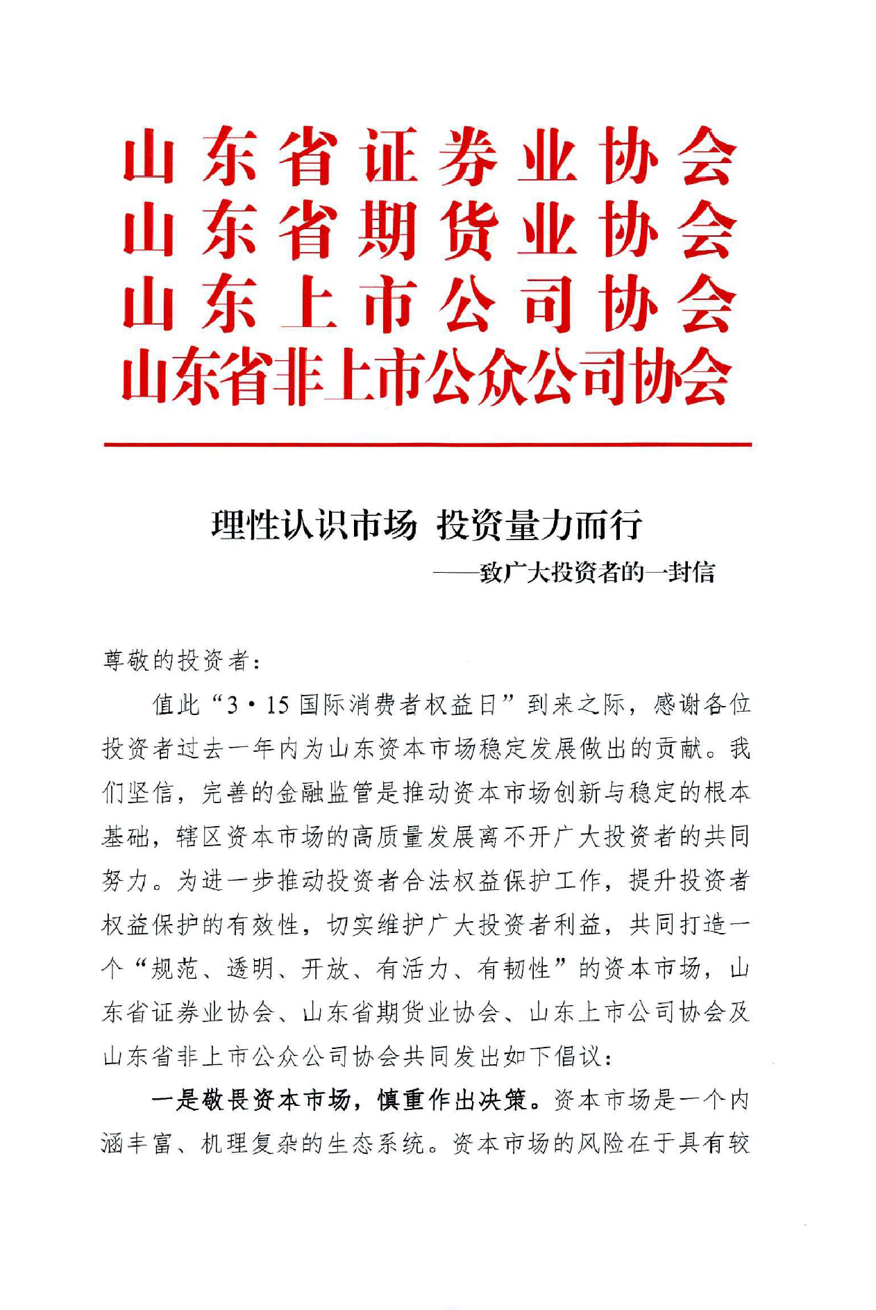 理性认识市场 投资量力而行—致广大投资者的一封信